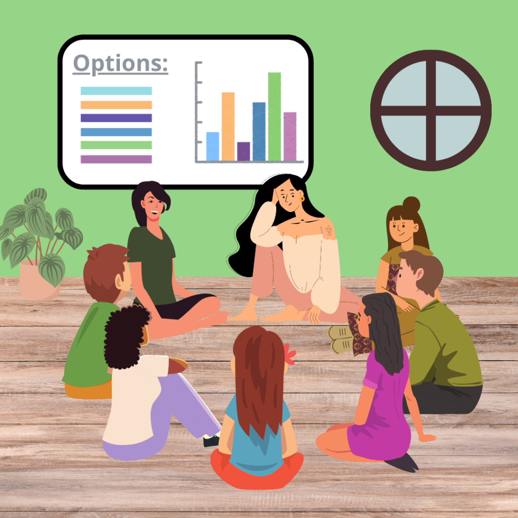Wie sieht eine Gruppe aus, die eine Konsensentscheidung trifft? Wie vermitteln wir die Tatsache, dass eine Gemeinschaft die Bedürfnisse all ihrer Mitglieder ernst nimmt? Von solchen Bildern gibt es bisher nur wenige – aber sie wären sehr hilfreich und wichtig, um uns eine radikal demokratisierte Gesellschaft vorzustellen.