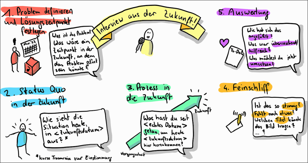 Das Interview aus der Zukunft ist eine Coaching-Methode, mit der man die eigene Utopiefähigkeit stärken kann. Ausgehend von einem aktuellen Problem entwickelt man kreativ ein wünschenswertes Zukunftsszenario und verschafft sich Inspiration für nächste Schritte.